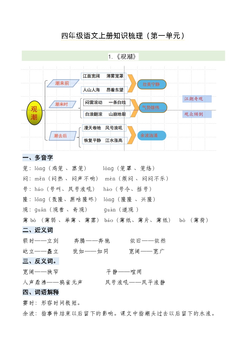 部编版四年级语文上册第一单元以"自然之美"为主题,精选多篇描写自然景观的优美文章。本单元着重培养观察能力和语言积累。