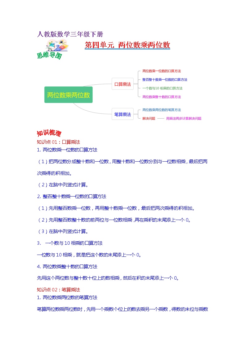 人教版三年级数学下册第四单元重点学习两位数乘两位数的计算方法,这是整数乘法运算的重要阶段。鸡娃题库为您提供本单元全套教学资源。