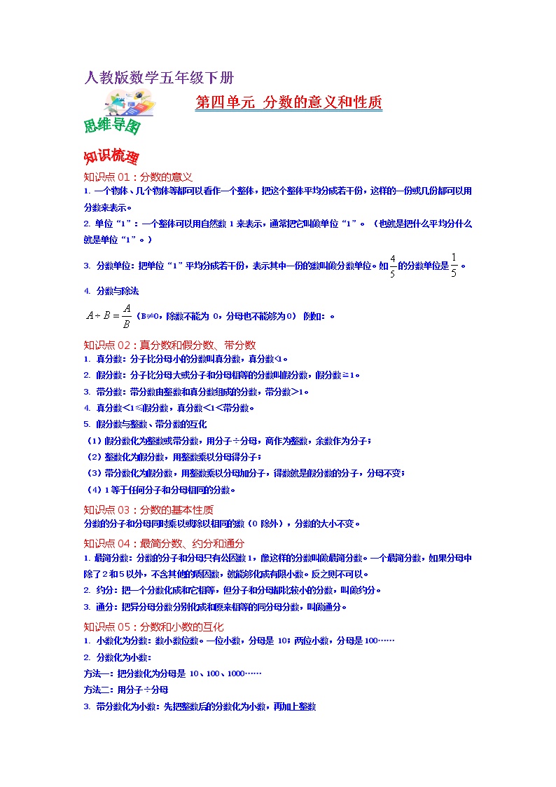 人教版五年级数学下册第四单元聚焦分数的意义和性质,这是小学数学从整数到分数的重要过渡,为后续分数运算打下坚实基础。