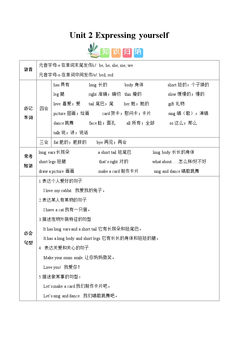 新人教PEP版三年级英语第二单元聚焦"自我表达"主题,涵盖情感表达、简单需求陈述等日常用语。这份知识清单提炼教材精华,帮助孩子快速掌握重点句型。