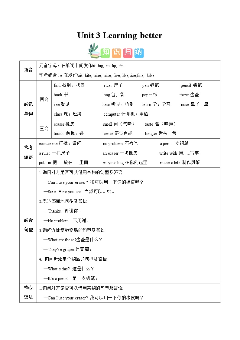 📚 新人教PEP版小学英语三年级下册Unit 3知识清单免费下载 📚