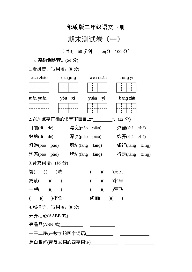 亲爱的家长们,鸡娃题库为您精心准备了部编版二年级语文下册期末测试卷1📝。这份测试卷完美匹配学期末复习需求,包含完整答案,高清可打印,是检验孩子整个学期学习成果的理想工具。