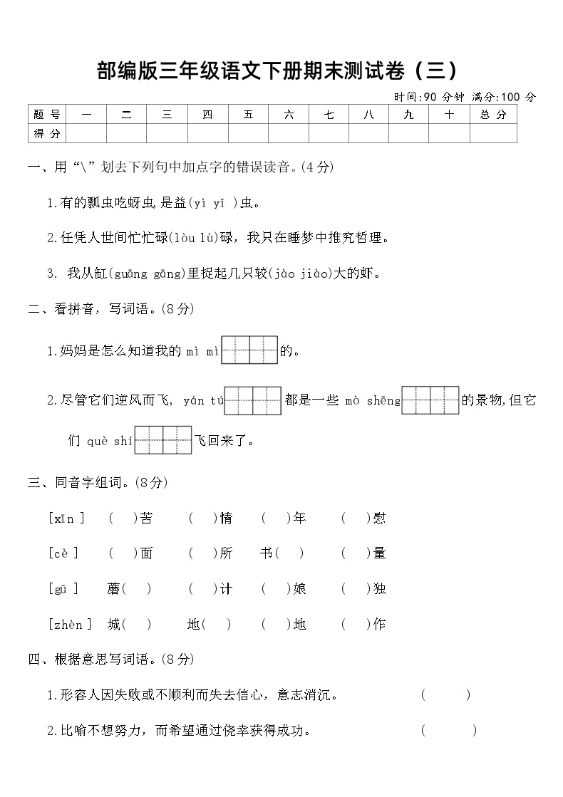 亲爱的家长朋友们,部编版三年级语文下册期末测试卷(三)震撼来袭!这份含答案的高清可打印资源,为孩子的期末复习提供强力支持。