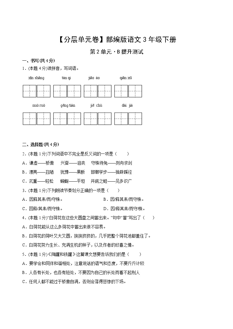 鸡娃题库推出部编版三年级语文下册第二单元B提升测试卷!免费提供下载,高清打印质量,答案详细完整。🌟📖