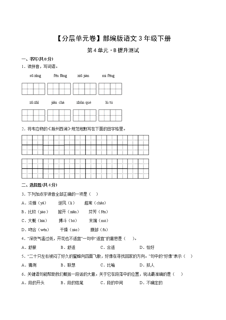 鸡娃题库推出部编版三年级语文下册第四单元B提升测试卷!免费资源,高清打印,答案完整,支持学习。🎓📚
