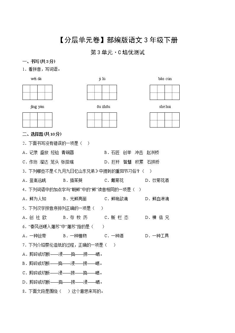 为您呈现部编版三年级语文下册第三单元C培优测试卷!鸡娃题库精品资源,免费下载使用,助力能力提升。📝✅