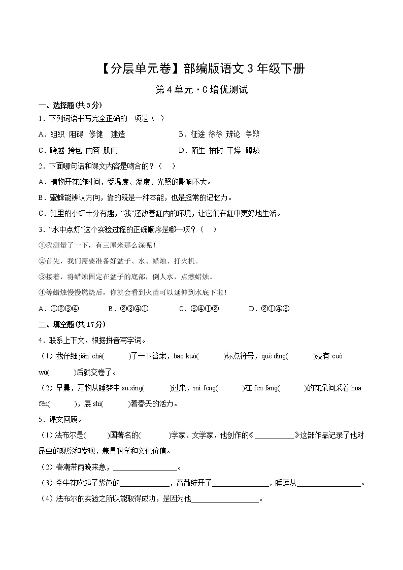 鸡娃题库推出部编版三年级语文下册第四单元C培优测试卷!免费提供下载,高清打印质量,答案详尽完整。🎓📚