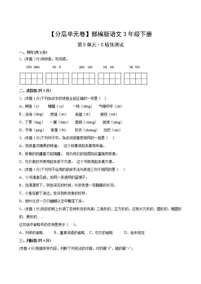 为您带来部编版三年级语文下册第五单元C培优测试卷!鸡娃题库优质资源,免费下载使用。✏️🌈