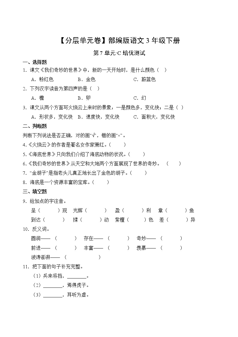 为您推荐部编版三年级语文下册第七单元C培优测试卷!鸡娃题库精品资源,免费下载使用。🎒📝