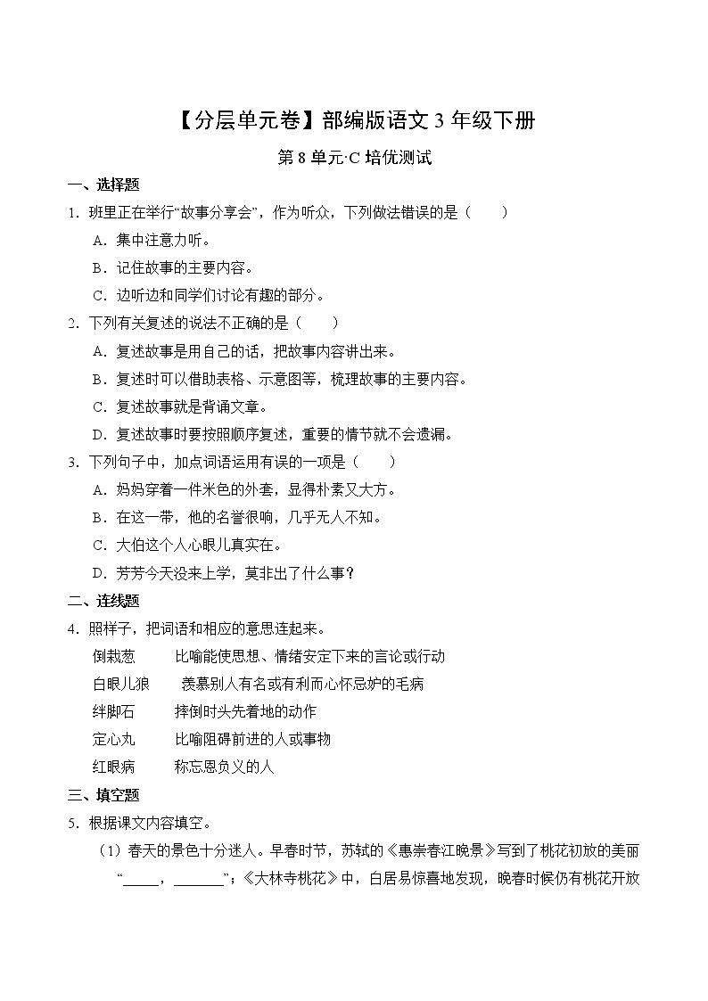 鸡娃题库完整推出部编版三年级语文下册第八单元C培优测试卷!全套C培优资源,免费下载使用。🏁🎉