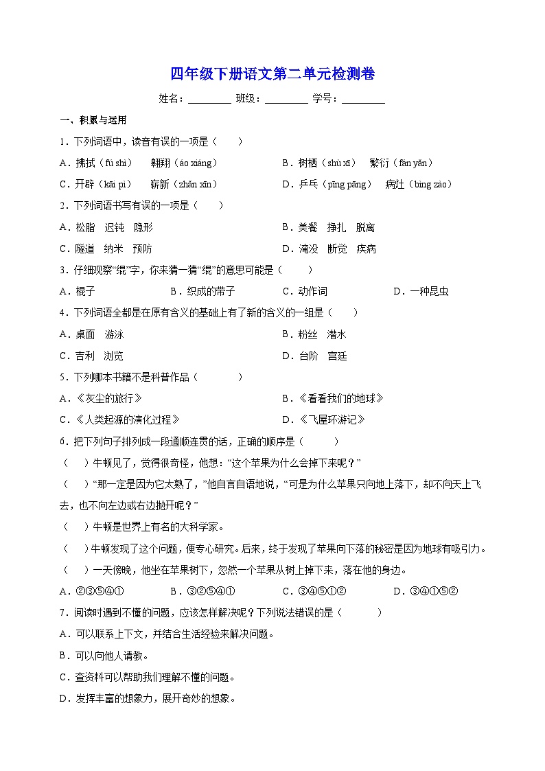 鸡娃题库推出统编版四年级下册语文第二单元检测卷!免费资源下载,高清打印质量,答案完整详细。🌟📖
