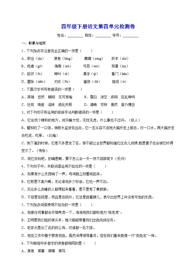 鸡娃题库推出统编版四年级下册语文第四单元检测卷!免费提供下载,高清打印质量。🎓📚