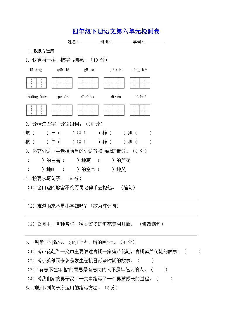 鸡娃题库呈现统编版四年级下册语文第六单元检测卷!免费资源下载。📘💫 第六单元检测卷注重综合能力的培养,通过系统的题型设计,帮助孩子全面提升语文素养和学习能力。 🌟 教学价值:培养综合能力,提升学习效果,促进个性发展 ✅ 学习建议 定期进行检测练习 建立错题档案 总结学习方法 分享学习心得 单元检测是学习过程中的重要环节,通过检测可以及时调整学习策略,提高学习质量。 百度网盘