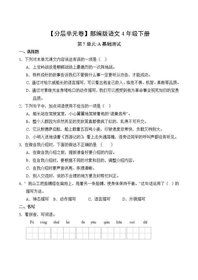 为您推荐部编版四年级语文下册第七单元A基础测试卷!鸡娃题库精品资源。🎒📝