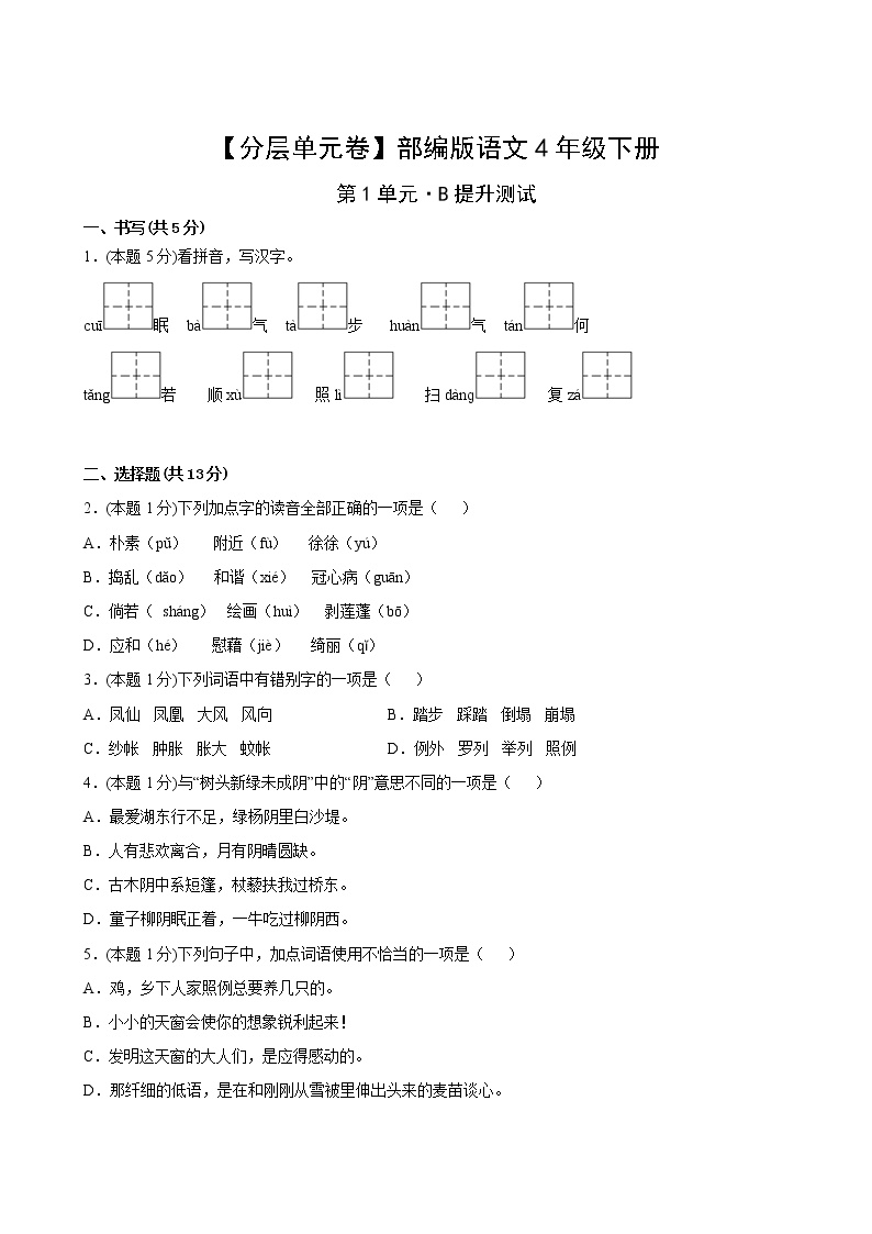 鸡娃题库为您精心准备部编版四年级语文下册第一单元B提升测试卷!完全免费提供下载,高清打印品质,附带详细答案解析。📚✨