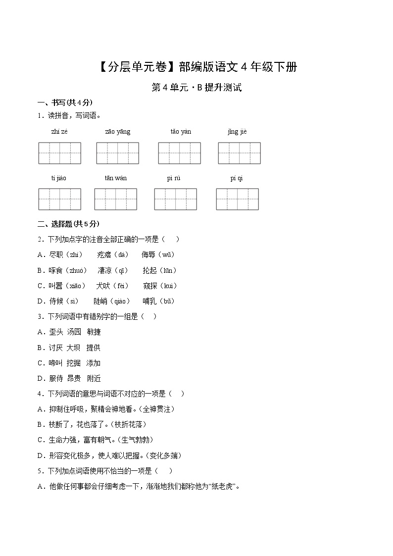 鸡娃题库推出部编版四年级语文下册第四单元B提升测试卷!免费提供下载,高清打印质量。🎓📚