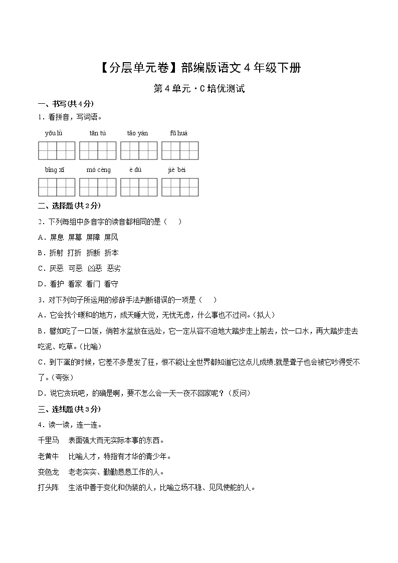 鸡娃题库(www.jiwatiku.cn)一如既往地支持您的家庭教育。现发布部编版小学四年级语文下册第四单元C培优测试卷,助力孩子迎接阶段性的学习检验。
