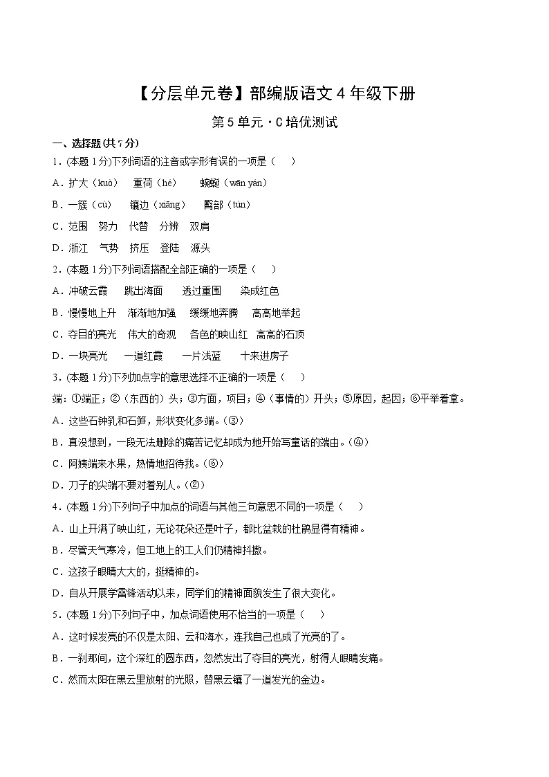 鸡娃题库(www.jiwatiku.cn)继续为您分享优质资源。本期推出部编版小学四年级语文下册第五单元C培优测试卷,陪伴孩子度过每一个关键的学习阶段。