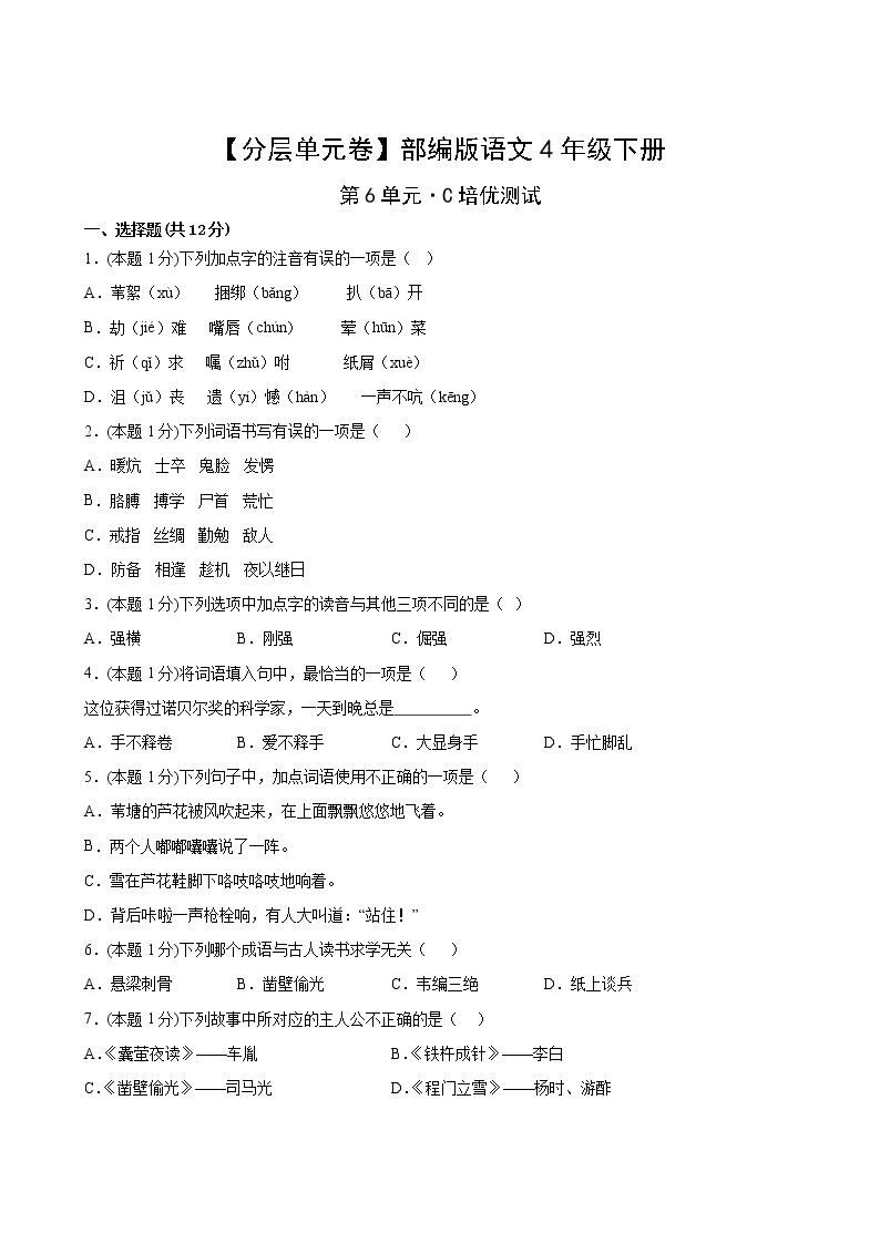 - 资源名称:四年级语文下册第六单元培优卷