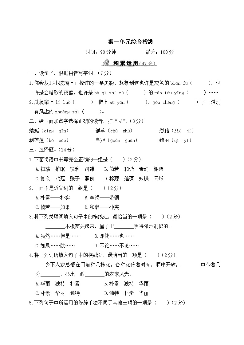 欢迎来到鸡娃题库(www.jiwatiku.cn)!我们为您精心准备了部编版四年级语文下册第一单元综合检测卷,这份资源包含完整答案,支持高清打印,完全免费下载!