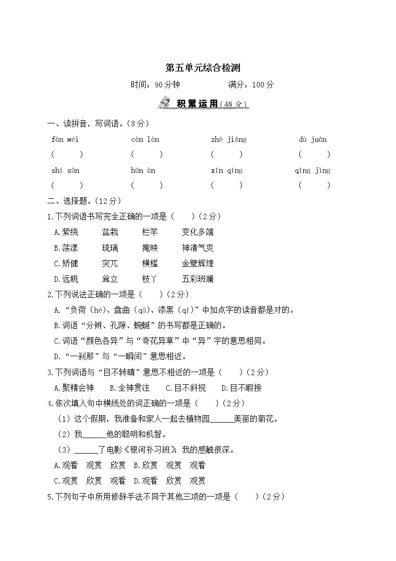 第五单元进入学期中段,学习要求进一步提高。我们的检测卷准确把握教学要求,题目设计既体现基础性,又具有一定挑战性。