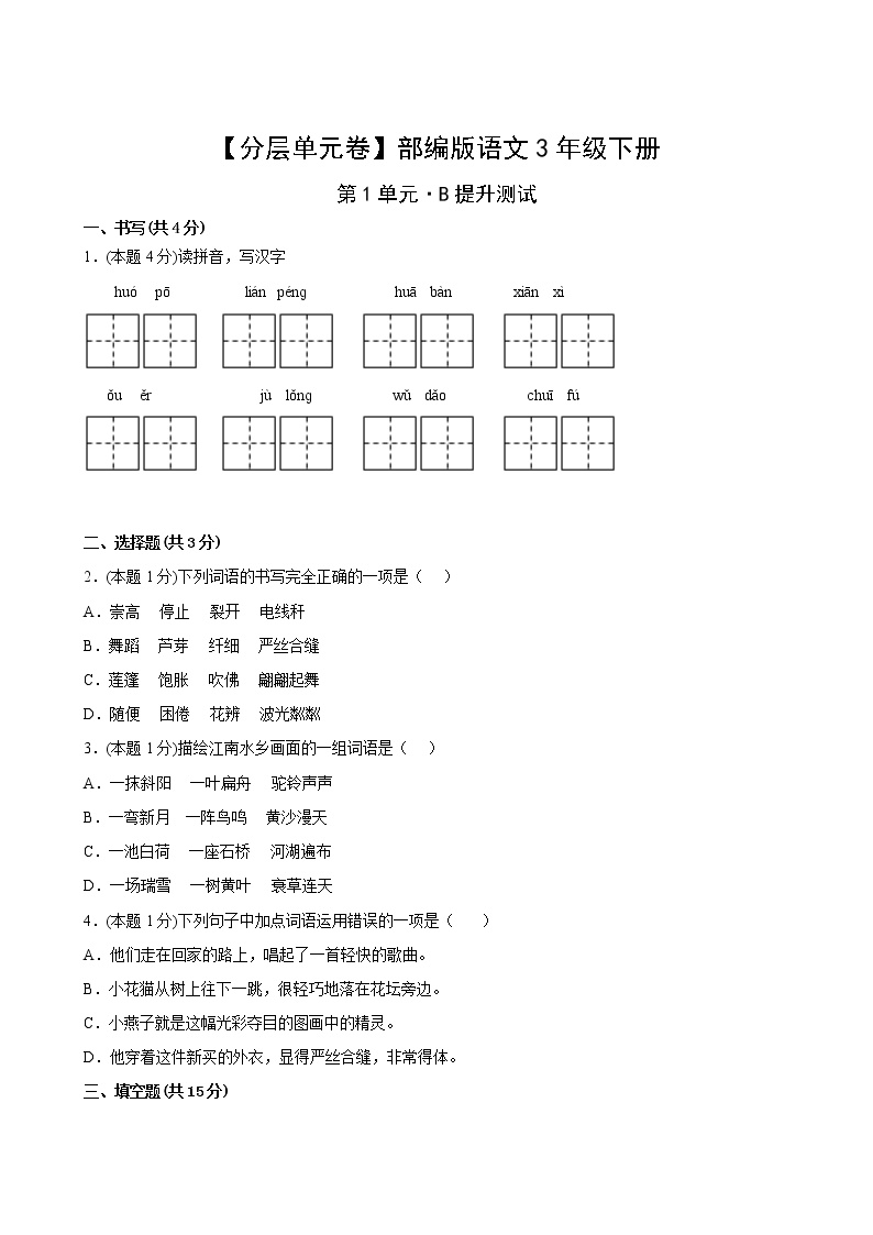 鸡娃题库为您精心准备部编版三年级语文下册第一单元B提升测试卷!这份优质资源完全免费,支持高清打印,附带详细答案解析。📚✨