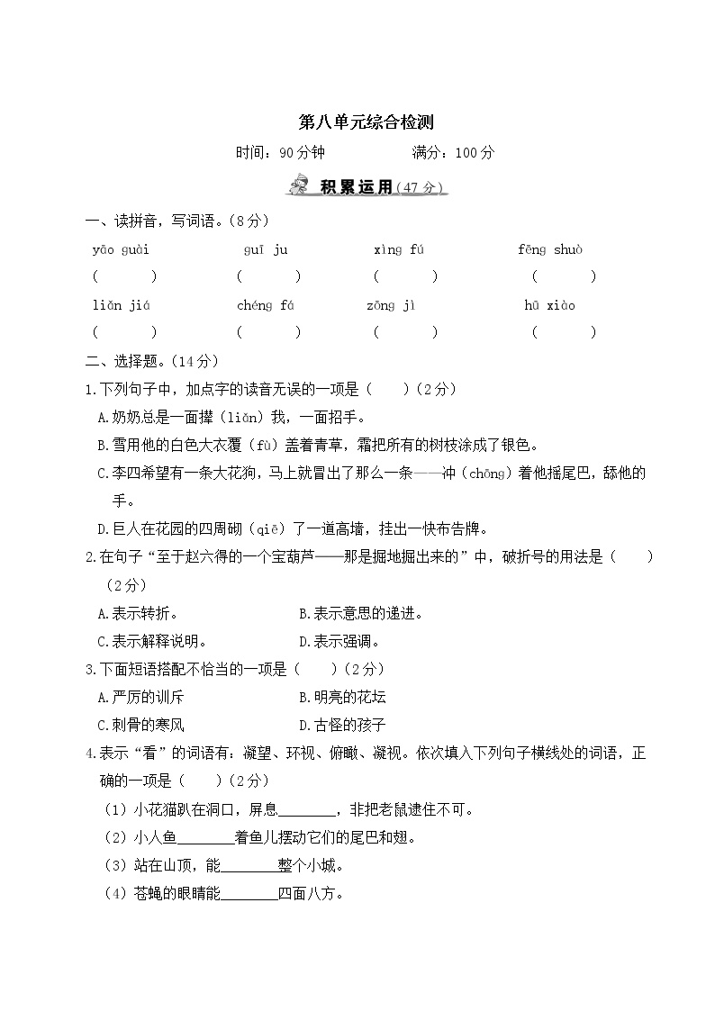 第八单元作为学期收官之单元,其检测具有重要意义。我们的检测卷既关注本单元内容,又适当融入前面单元的要点,起到总复习的作用。