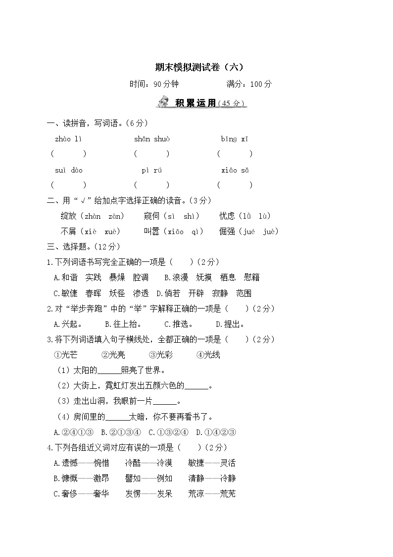 鸡娃题库继续为您服务!现发布部编版小学四年级语文下册期末模拟测试卷(六),为孩子的期末复习提供专业支持。