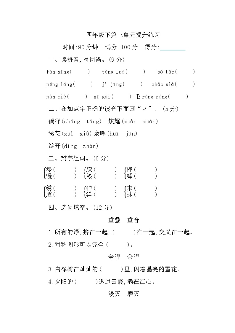 各位家长好!鸡娃题库为您带来部编版小学四年级下册语文第三单元测试卷,这是孩子中期学习的重要检测工具。