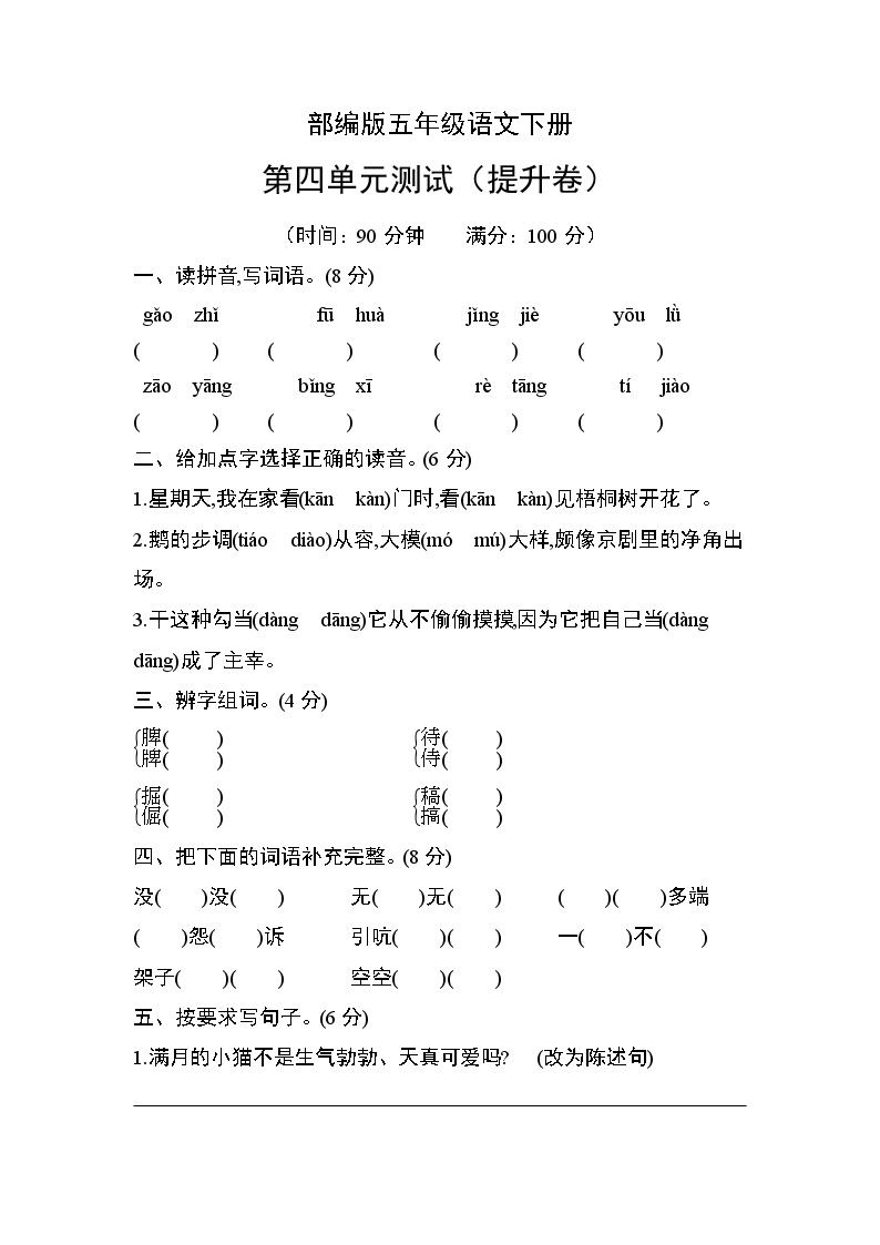 第四单元提升卷聚焦语言积累和文化传承,包含丰富的古诗文知识和传统文化内容。题目设计既保持传统特色,又融入现代元素。