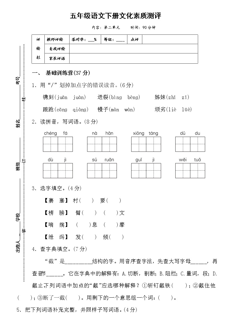 鸡娃题库为您带来部编版小学五年级语文下册第二单元文化素质测评卷!🎉 这份资源专门为检测第二单元学习效果而设计,帮助孩子巩固知识,提升能力。