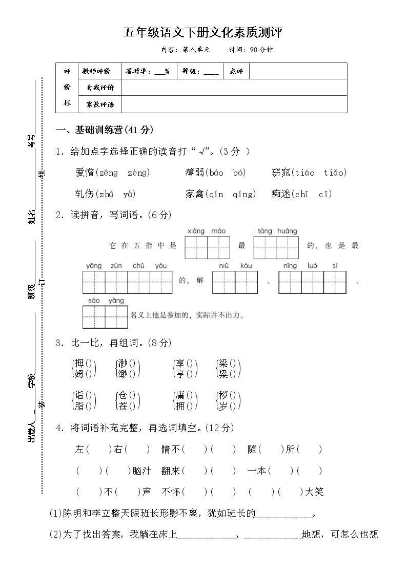 鸡娃题库完整呈现部编版小学五年级语文下册第八单元文化素质测评卷!🎊 全套单元测评收官之作,助力期末总复习。