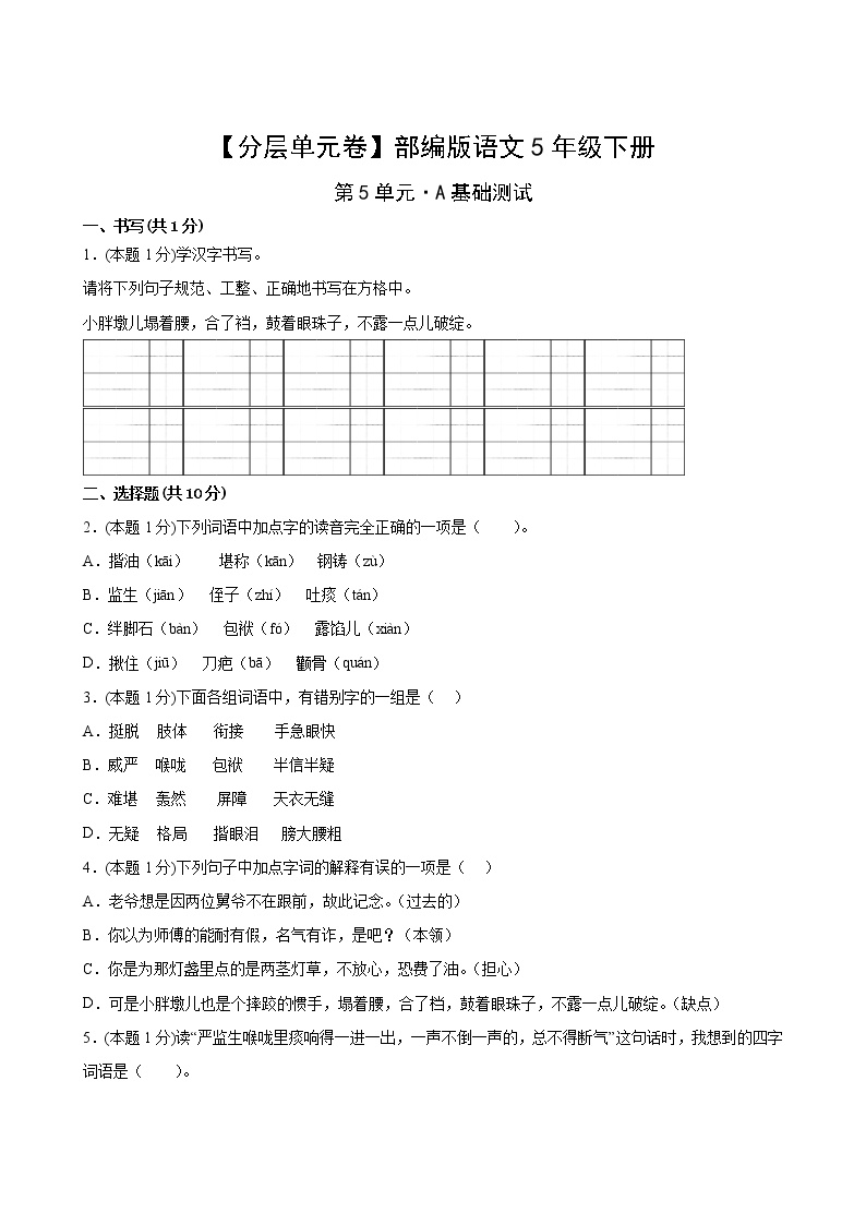 鸡娃题库推出部编版小学五年级语文下册第五单元A基础测试卷!🚀 期中阶段的重要学习辅助资源。