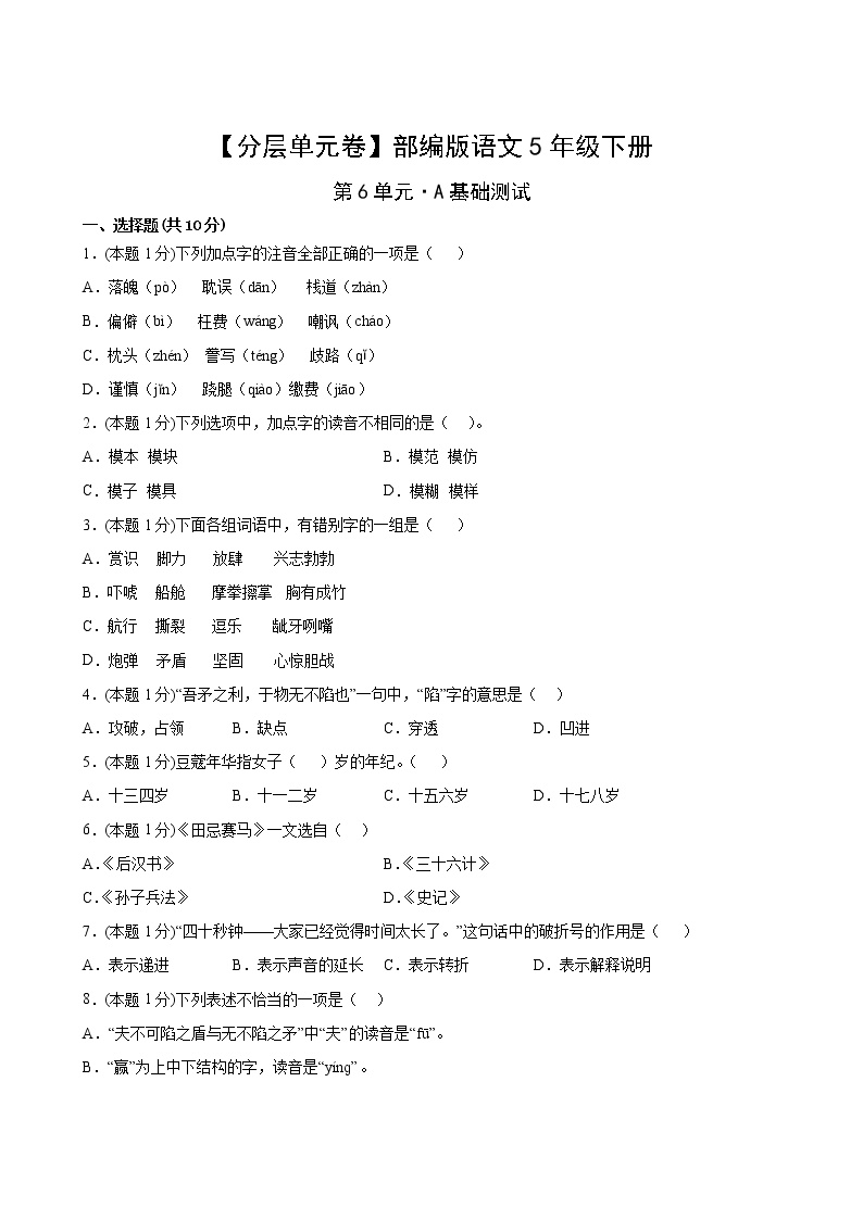 鸡娃题库分享部编版小学五年级语文下册第六单元A基础测试卷!⭐ 期末复习阶段的重要基础训练资源。