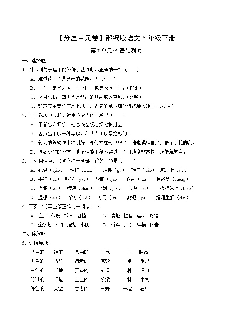 鸡娃题库提供部编版小学五年级语文下册第七单元A基础测试卷!🎓 期末前的重要基础巩固资源。
