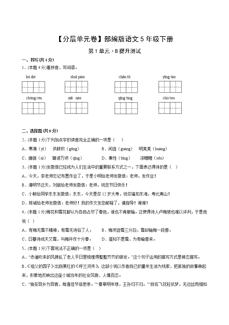 亲爱的家长朋友们,鸡娃题库为您带来部编版小学五年级语文下册第一单元B提升测试卷!🚀 这份试卷专为学有余力的孩子设计,帮助他们在基础之上实现能力飞跃。