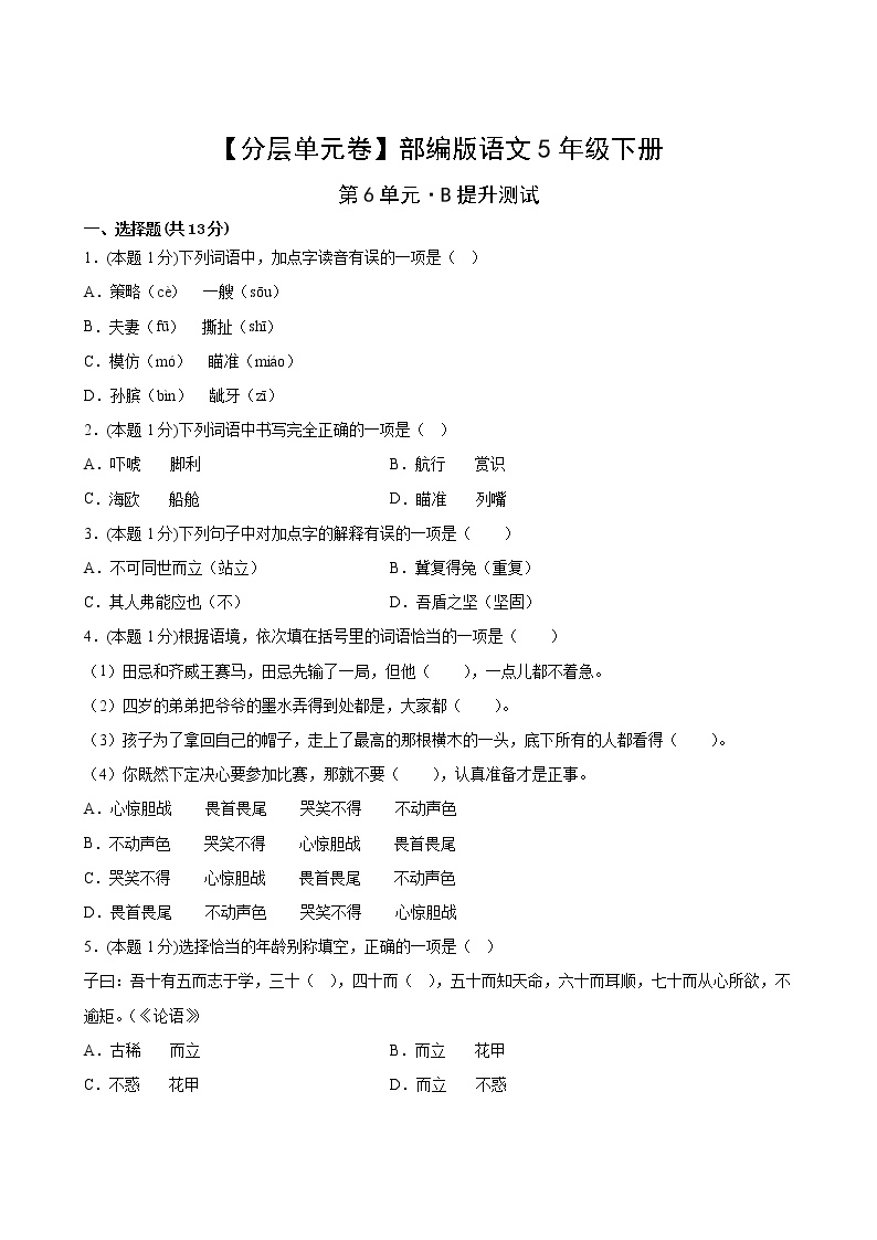 鸡娃题库分享部编版小学五年级语文下册第六单元B提升测试卷!⭐ 期末前的重要提升训练。