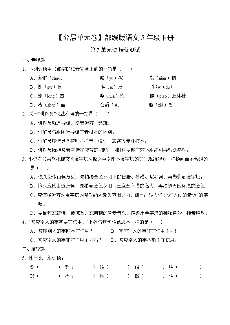 鸡娃题库(www.jiwatiku.cn)为您精心准备第七单元学习资源!🍀 本次分享的是部编版小学五年级语文下册第七单元C培优测试卷,帮助孩子巩固知识,拓展思维。