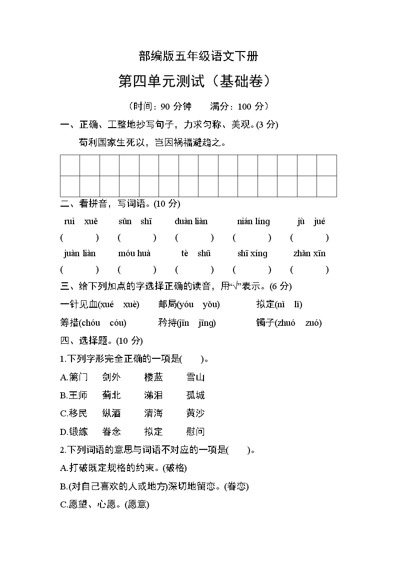 鸡娃题库为您精心准备了部编版小学五年级语文下册第四单元测试(基础卷)📘。本试卷全面覆盖第四单元重点难点,帮助孩子巩固知识,检测学习效果。
