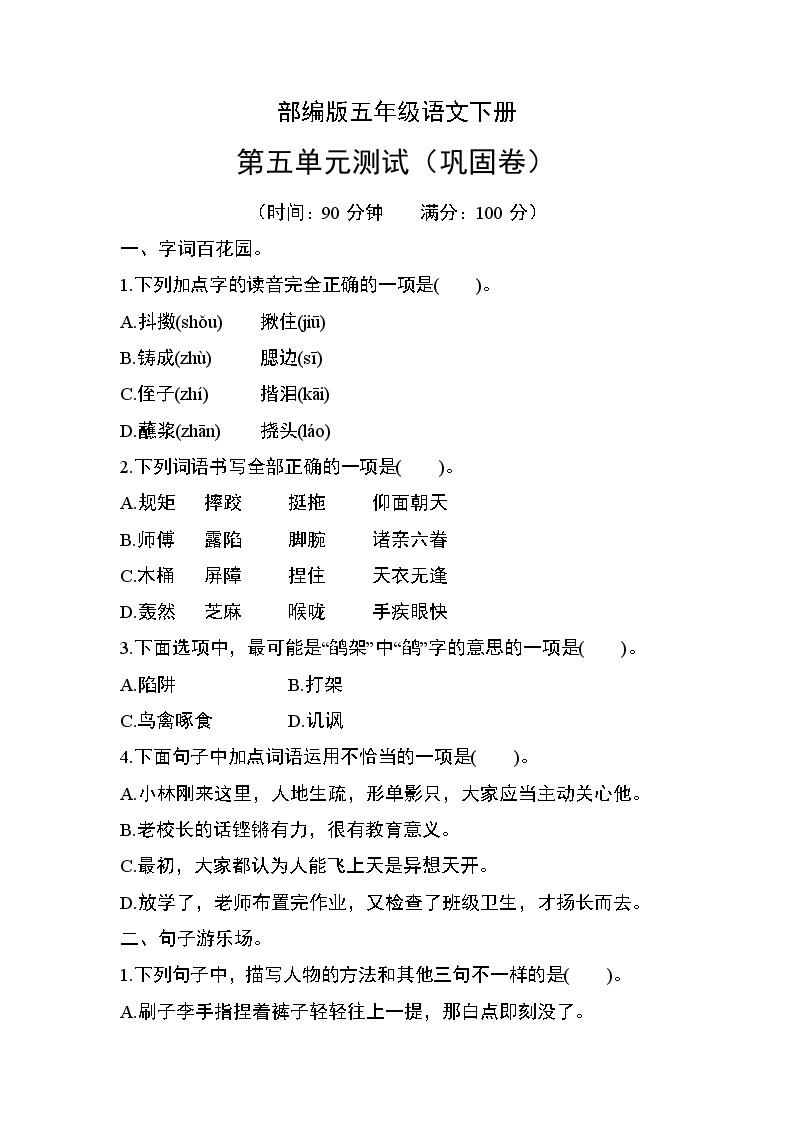 鸡娃题库推出部编版小学五年级语文下册第五单元测试(巩固卷)📗。本套试卷专为强化第五单元知识点设计,题目难度适当提升,帮助学生深入掌握核心内容。