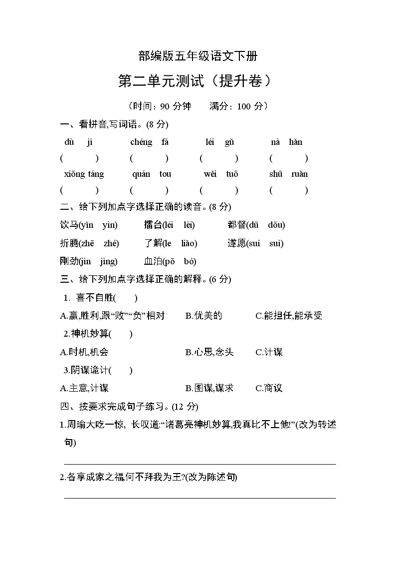 鸡娃题库推出部编版小学五年级语文下册第二单元测试(提升卷)📈。本套试卷专为追求卓越的学生设计,题目难度显著提升,注重培养学生的批判性思维和创造性表达能力。