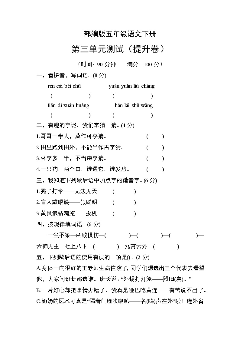 鸡娃题库为您呈现部编版小学五年级语文下册第三单元测试(提升卷)🎯。本套试卷专为语文能力较强的学生设计,题目难度较高,注重培养学生的文学素养和批判性思维。
