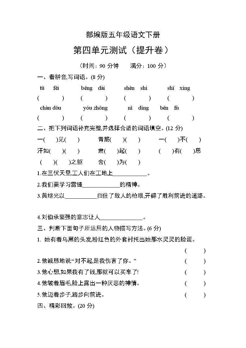鸡娃题库精心打造部编版小学五年级语文下册第四单元测试(提升卷)🏆。本套试卷面向语文学习能力突出的学生,题目设计极具挑战性,旨在拓展学生的文学视野和思维深度。