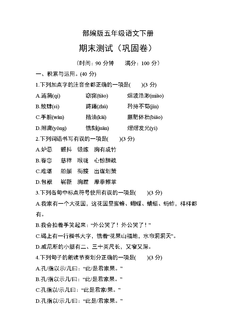 鸡娃题库(www.jiwatiku.cn)持续更新!现发布部编版五年级语文下册期末测试(巩固卷),附答案,高清可打印,免费下载!