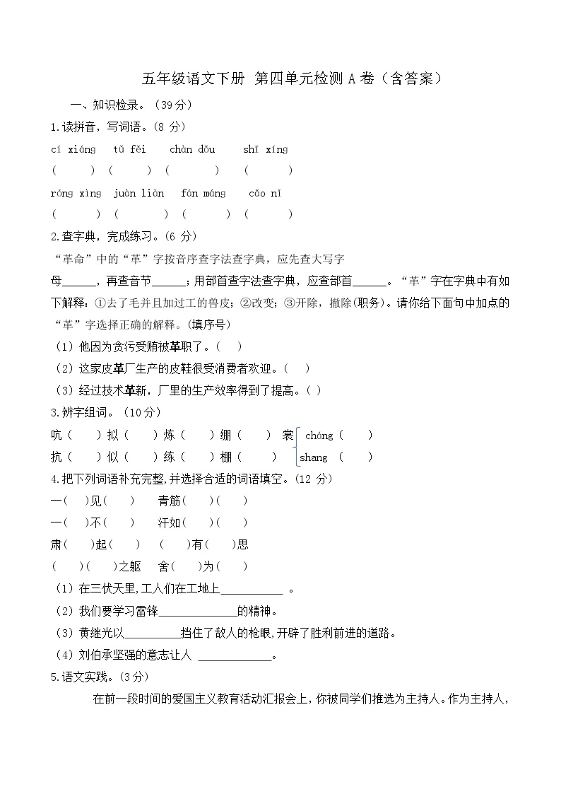 各位家长好!鸡娃题库为您带来部编版五年级语文下册第四单元检测A卷,试卷包含参考答案,高清可打印,免费分享!🌱