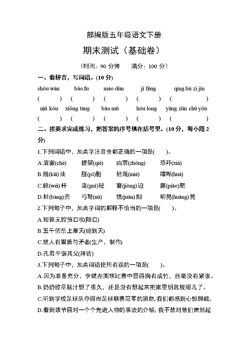 📚 部编版五年级语文下册期末测试(基础卷)