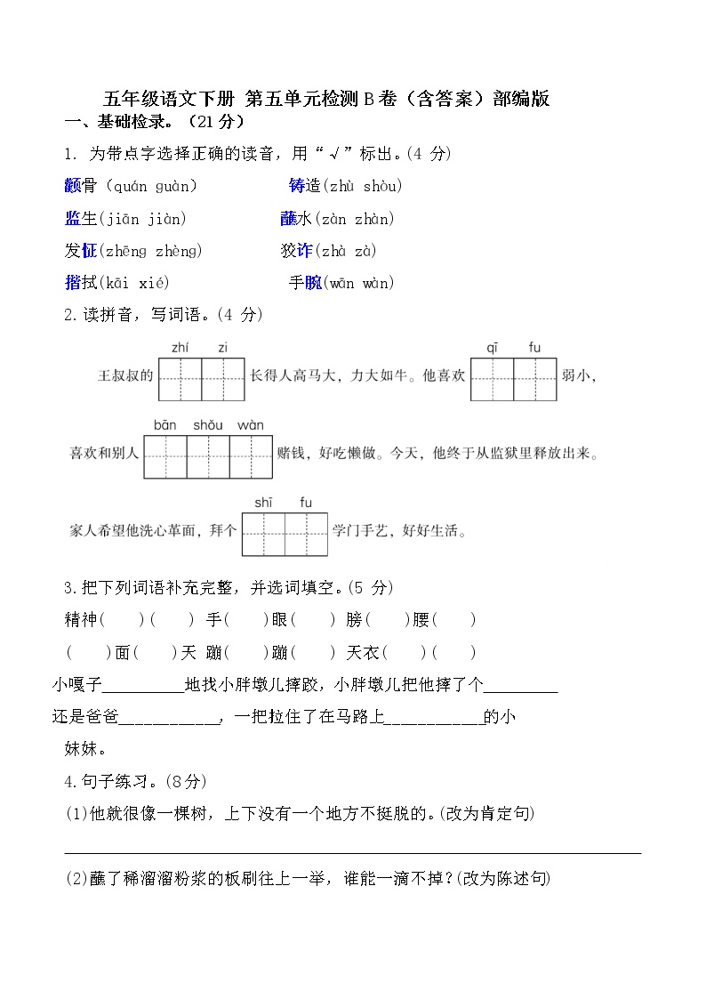 鸡娃题库新上架部编版五年级语文下册第五单元检测B卷,含答案可打印,免费下载使用!🎉