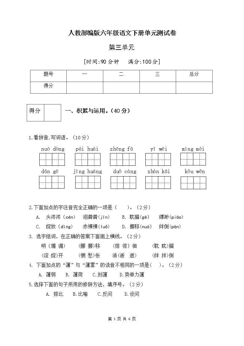 鸡娃题库为您推荐人教部编版六年级语文下册第三单元测试卷(二),试卷含答案,高清可打印,免费下载!🌱