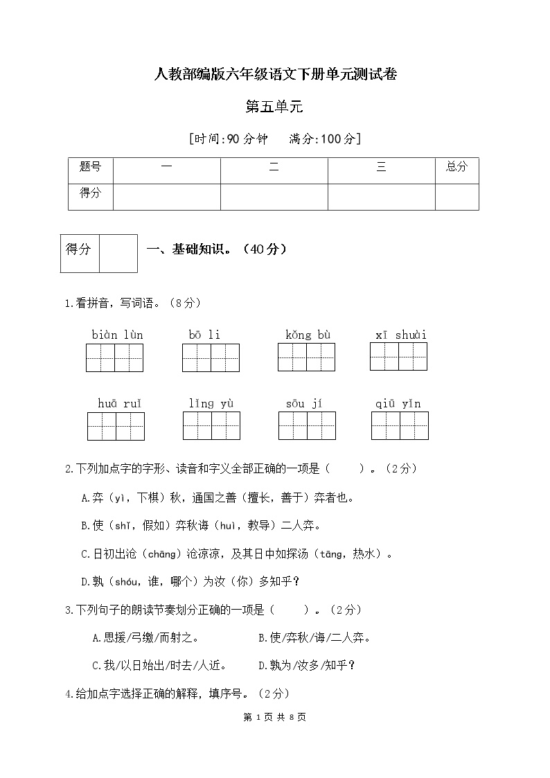 鸡娃题库发布人教部编版六年级语文下册第五单元测试卷(二),含完整答案,支持高清打印,免费下载!🌈