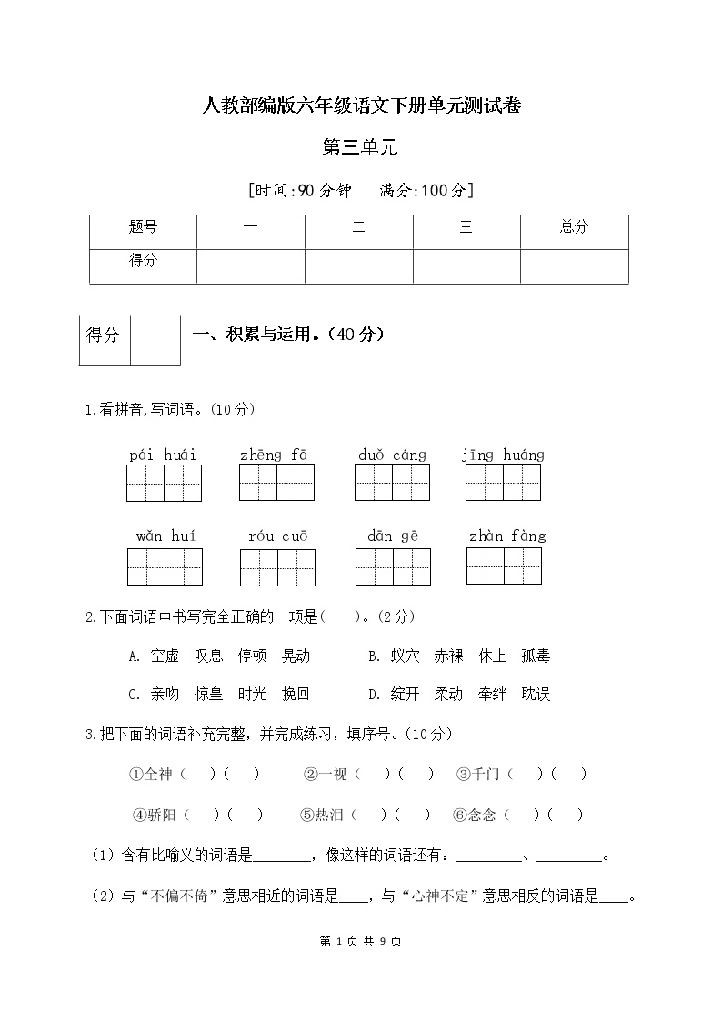 鸡娃题库精品推荐!人教部编版六年级语文下册第三单元测试卷(三)震撼来袭,试卷含答案,高清可打印,免费下载!🚀
